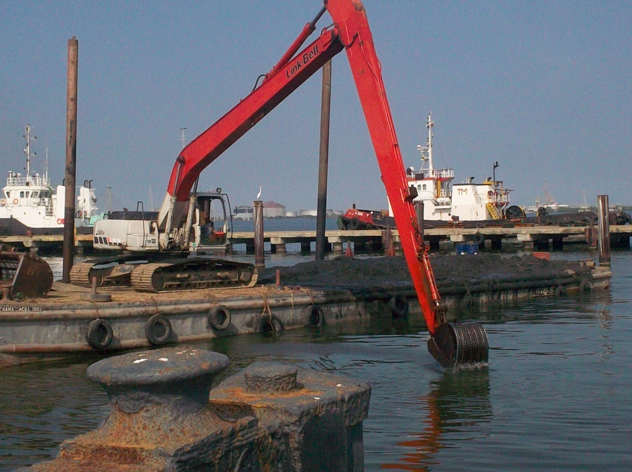 Excavador de largo alcance, gabarra plana y remolcador.